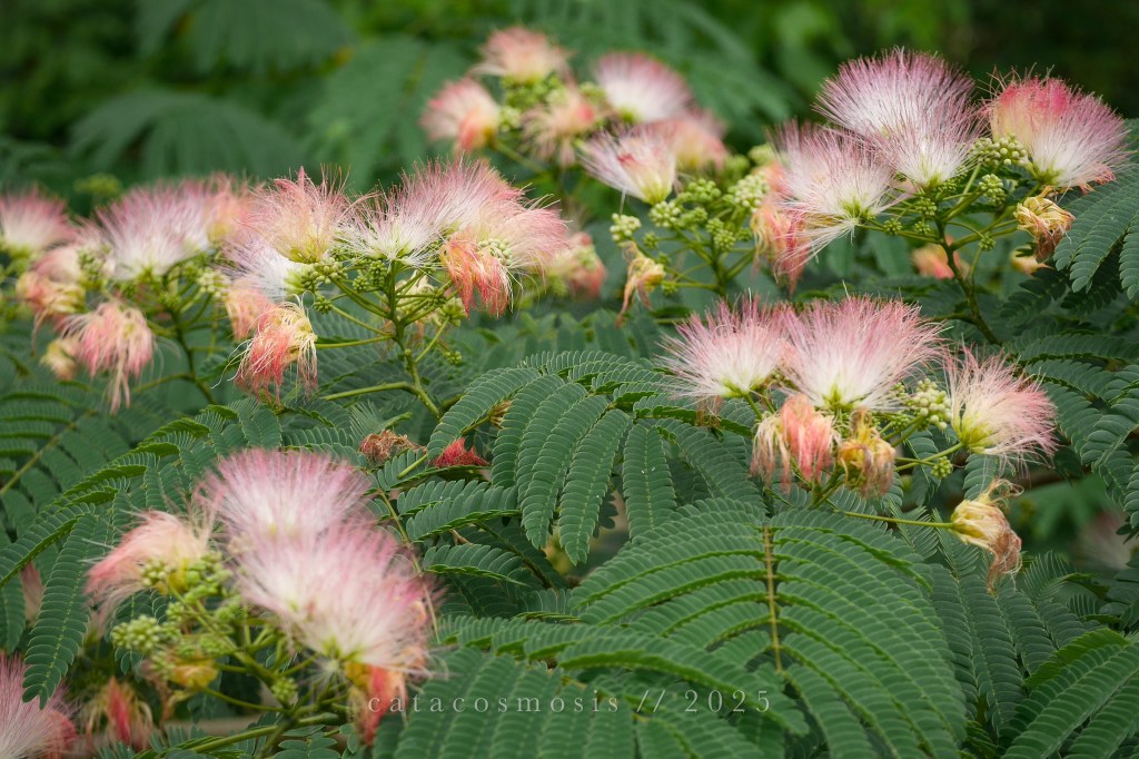 The mimosa blooms like a passing thought—pink, feathery, fragrant, gone before you’re ready. But even in its short season, it rewrites the air.